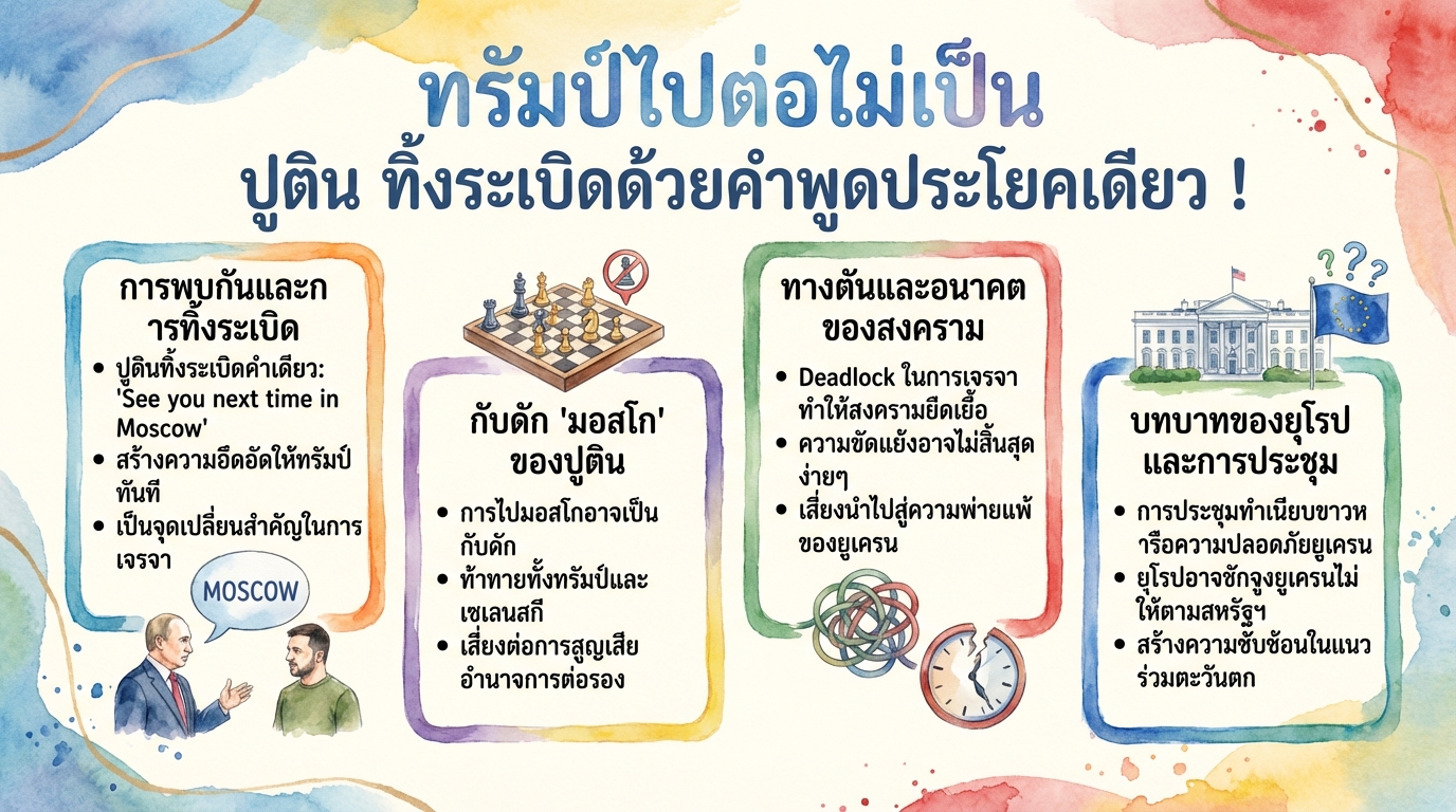 สถานการณ์ทางการเมืองโลกกำลังร้อนระอุ เมื่อคำพูดเพียงประโยคเดียวของประธานาธิบดีปูติน สร้างความอึดอัดให้กับอดีตประธานาธิบดีทรัมป์ และส่งผลกระทบต่ออนาคตของสงครามในยูเครน บทความนี้จะพาทุกท่านไปเจาะลึกถึงเบื้องหลังการประชุมทำเนียบขาว บทบาทของยุโรป และผลกระทบที่อาจเกิดขึ้นจากการตัดสินใจครั้งสำคัญนี้ พร้อมวิเคราะห์สถานการณ์ล่าสุดอย่างเจาะลึก เพื่อให้คุณเข้าใจภาพรวมของสถานการณ์ได้อย่างครบถ้วน